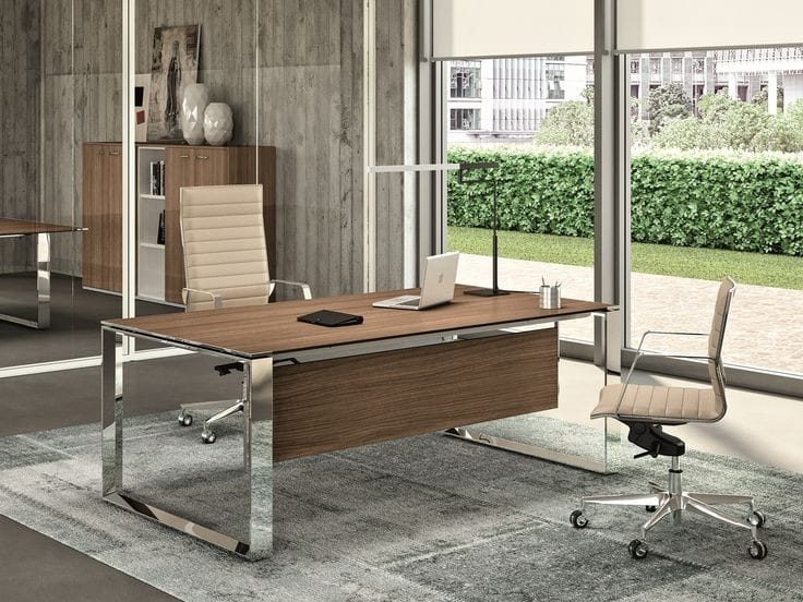 مكتب مدير مقاس 200سم مصنع من الخشب mdf روماني وملصق قشرةصناعي ومزود بقشاط من الاستانلس مقاوم للخدش والاحتكاك سمك القرصة 25 ملي وسمك الاجناب 34 مملي مزود بسايد مقاس 160 سم مكون من 3 درج 2 ضلفه