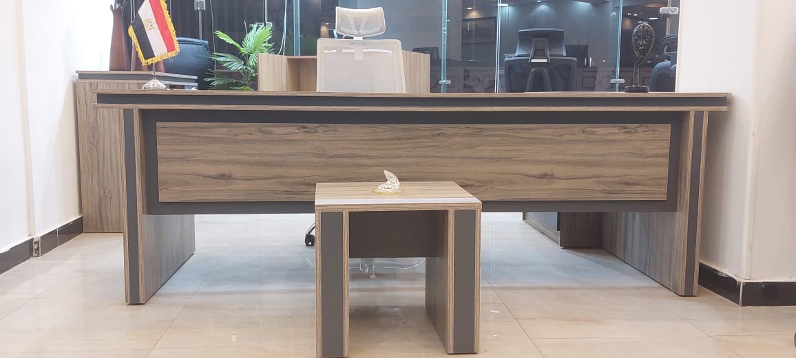 مكتب مدير مقاس 200سم مصنع من الخشب mdf روماني وملصق قشرةصناعي ومزود بقشاط من الاستانلس مقاوم للخدش والاحتكاك سمك القرصة 25 ملي وسمك الاجناب 34 مملي مزود بسايد مقاس 160 سم مكون من 3 درج 2 ضلفه