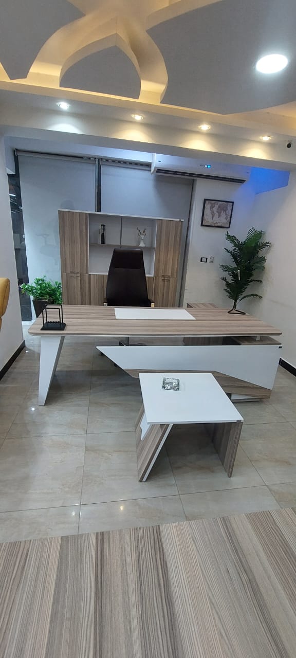 مكتب مدير مقاس 200سم مصنع من الخشب mdf روماني وملصق قشرةصناعي ومزود بقشاط من الاستانلس مقاوم للخدش والاحتكاك سمك القرصة 25 ملي وسمك الاجناب 34 مملي مزود بسايد مقاس 160 سم مكون من 3 درج 2 ضلفه
