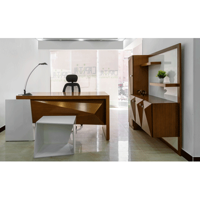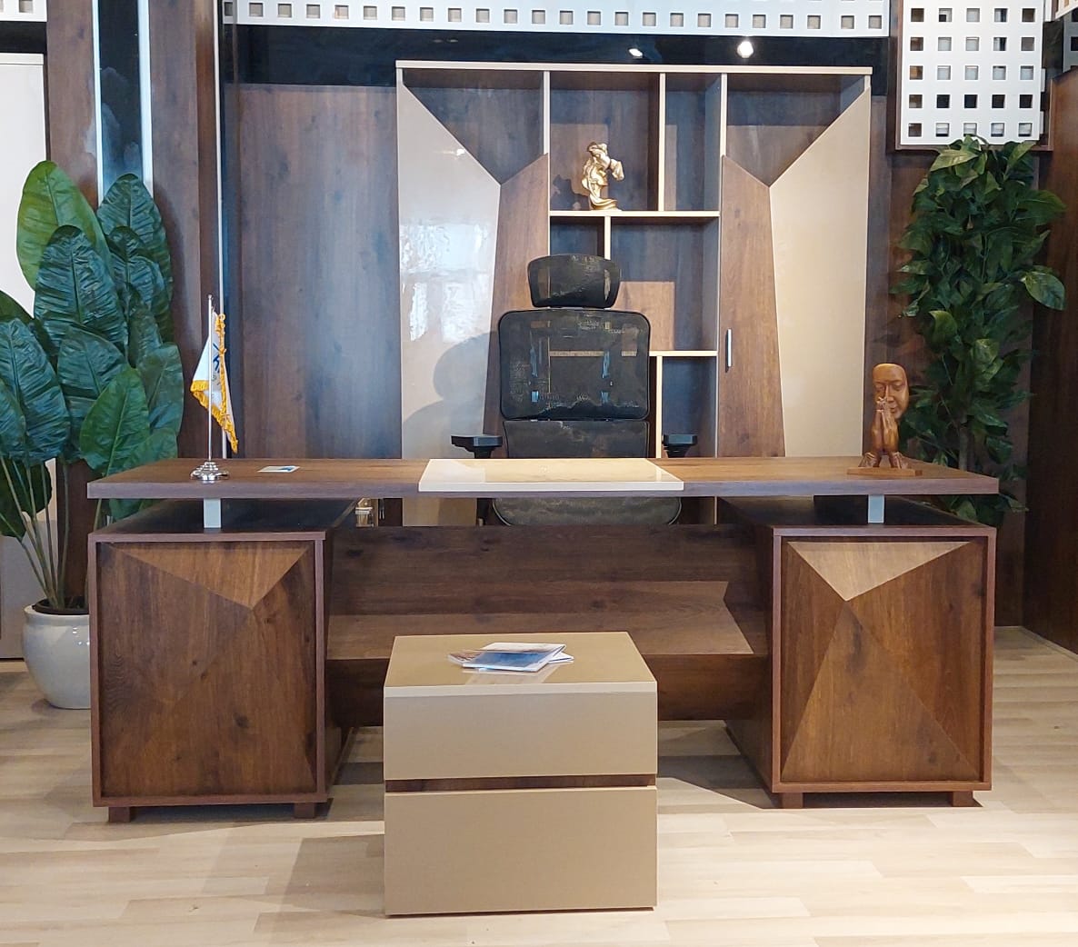 مكتب مدير مقاس 200سم مصنع من الخشب mdf روماني وملصق قشرةصناعي ومزود بقشاط من الاستانلس مقاوم للخدش والاحتكاك سمك القرصة 25 ملي وسمك الاجناب 34 مملي مزود بسايد مقاس 160 سم مكون من 3 درج 2 ضلفه