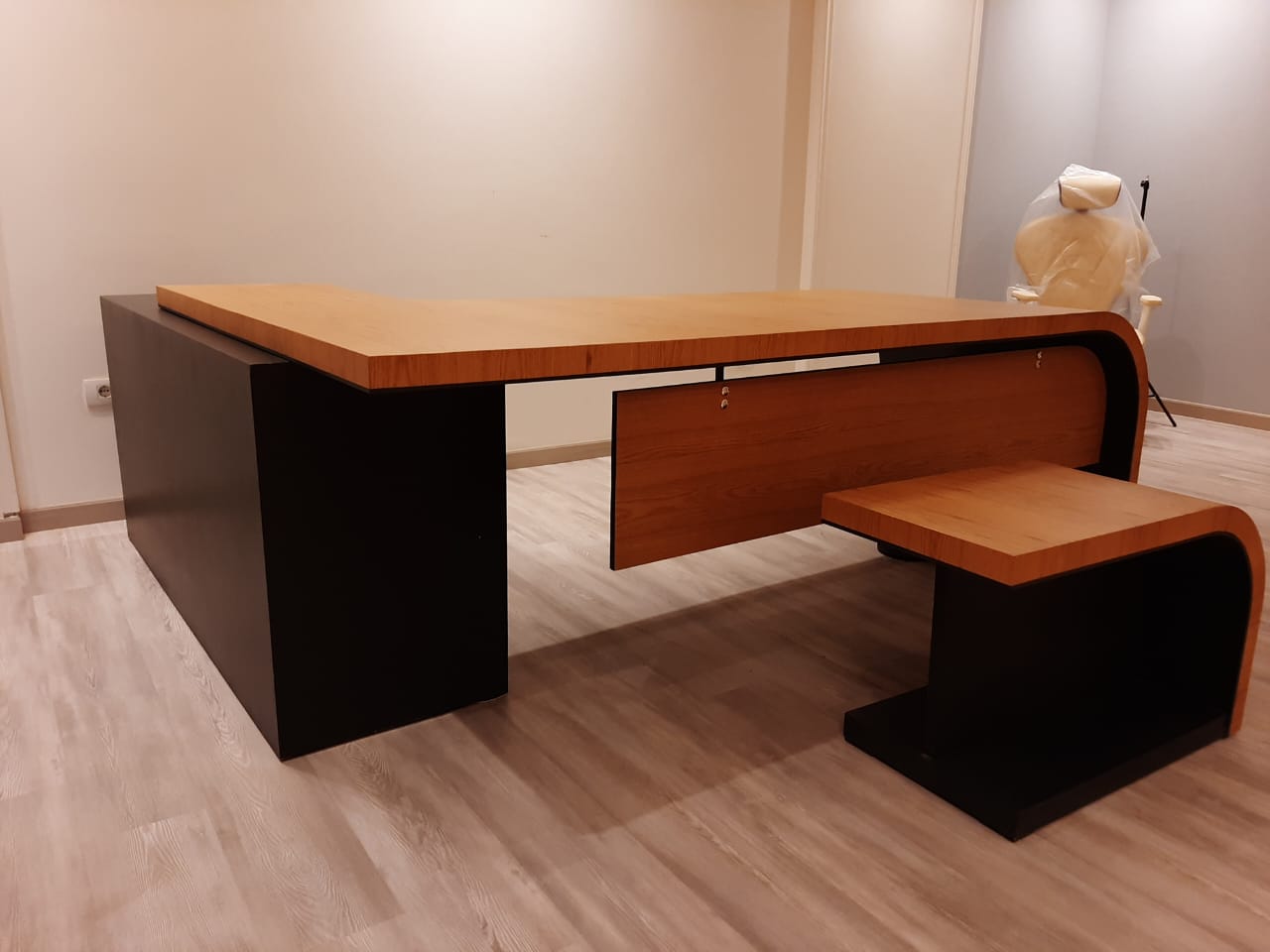 مكتب مدير مقاس 200سم مصنع من الخشب mdf وملصق قشرة طبيعي دهان بلوستير سمك القرصه 5سم مزود بسايد مكونه من 2ضلفه وحده ادراج مدهون دهان دوكو